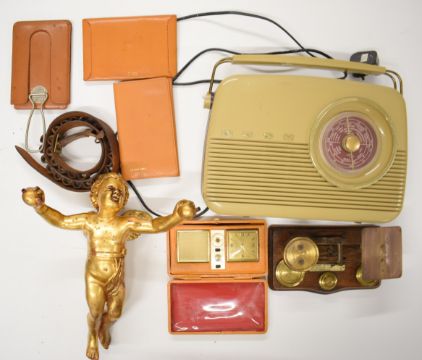 Bush radio, leather goods including travelling mirror Estyma travelling transistor radio, postal scales, gilded hanging putti etc
