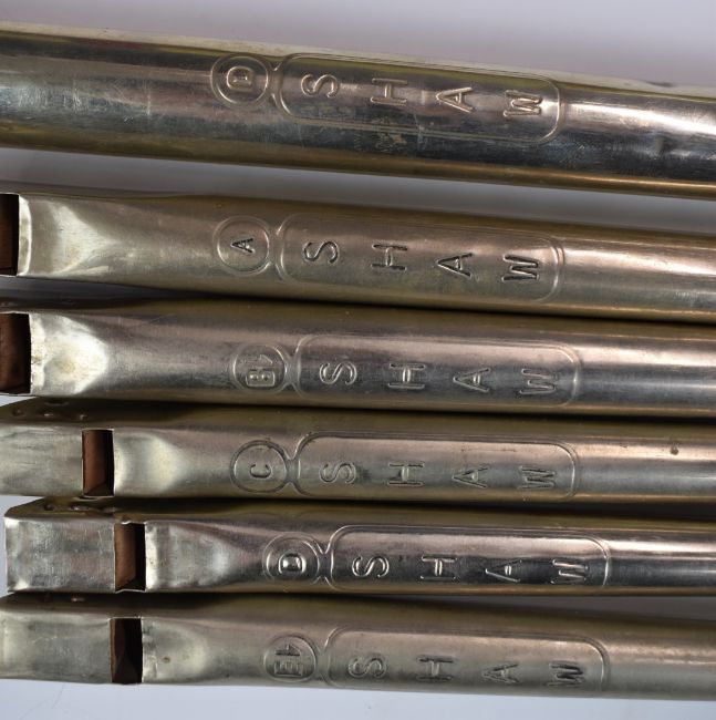 Six Shaw 'tin whistles' comprising A, Bb, Eb, C, D and low D, all graduated bodies with six holes, in lacquered case