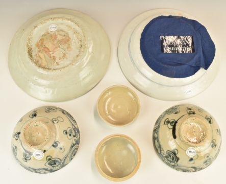 Chinese 17thC porcelain from the Binn Thuan shipwreck comprising a pair of pedestal dishes with bird decoration, a pair of pedestal bowls and a covered pot, largest diameter 25cm