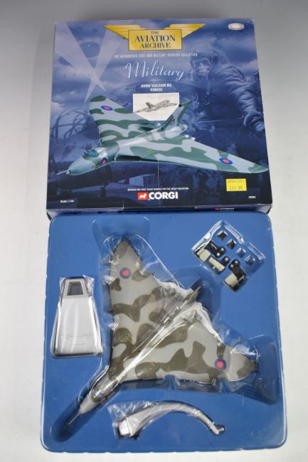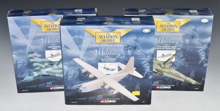 Three Corgi The Aviation Archive 1:144 scale diecast model aircraft comprising Avro Vulca B.2 'Dambusters' Squadron, AA31201, Avro Vulcan B2, 48304 and C130 K C1 Hercules RAF Desert Storm, 48405. All in original boxes with certificates.