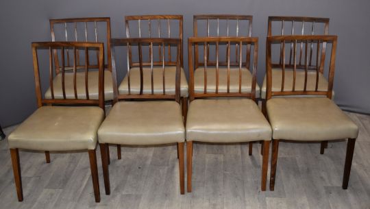 Retro / Arts & Crafts teak refectory dining table and eight upholstered chairs, probably Gordon Russell of Broadway, W198 x D95 x H73cm