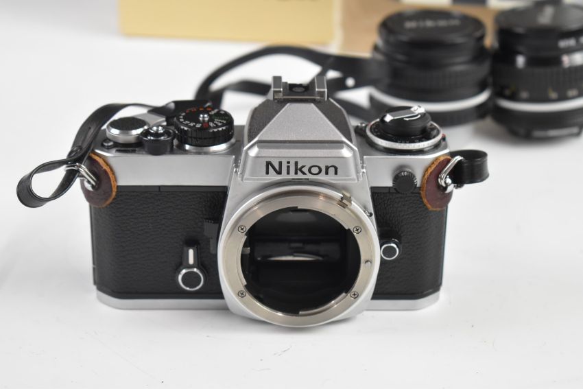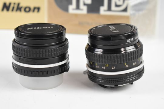 Nikon FE 35mm SLR camera with 28mm 1:2.8 and 50mm 1:2 lenses, together with original box and instructions for the body