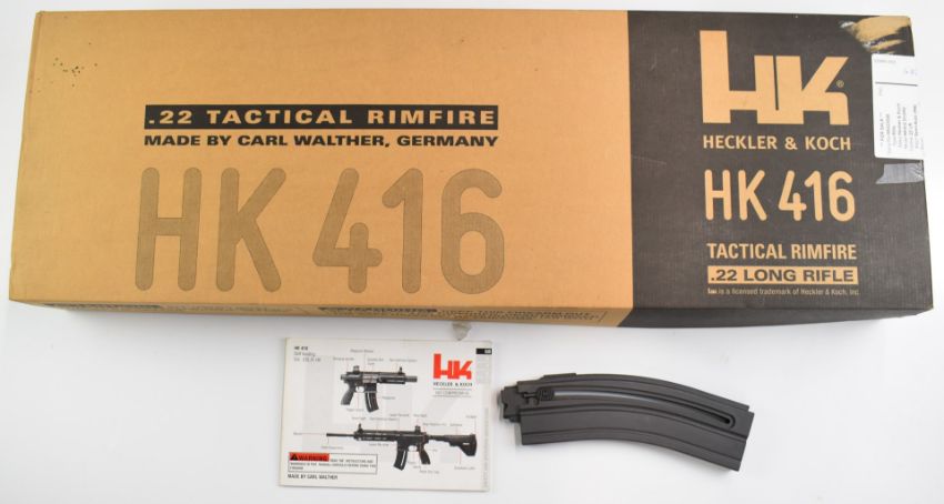 Heckler & Koch .22 semi-automatic assault style rifle with textured pistol grip, tactical stock, flash suppressor, 4x32 Mil-Dot R/G Ill and Hawke Sport Dot scopes and 12 inch barrel, serial number HK023586, in original box with spare magazine, accessories and related paperwork PLEASE NOTE THAT A VALID RELEVANT FIREARMS/SHOTGUN CERTIFICATE IS REQUIRED TO HANDLE/PURCHASE THIS ITEM.