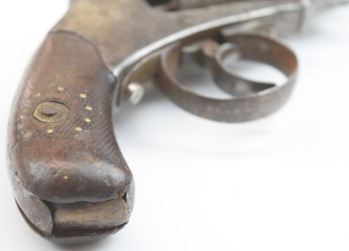 Unnamed 54 bore five shot self-cocking percussion revolver with chequered wooden grips, engraved hammer and 5 inch rifled octagonal barrel, overall length 26.5cm.