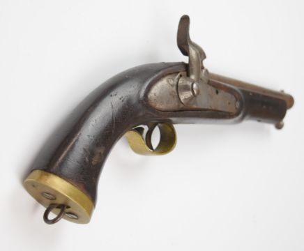 Sea Service type percussion hammer action pistol with Cyrillic text and 1831 to the lock, brass trigger guard and butt plate, belt loop, steel ram-rod and 7.5 inch smooth bored barrel, overall length 37cm.