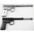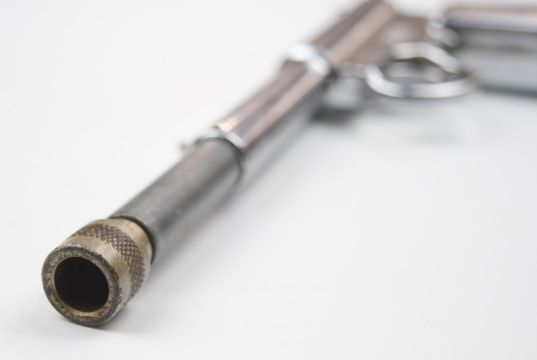 Two Umarex T J Harrington .177 'The Gat' air pistols, one with black painted and one with nickel plated finish, both have NVSN.