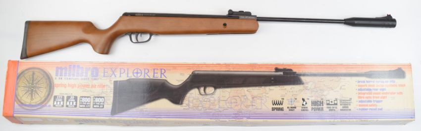 Milbro Explorer .177 break barrel air rifle with semi-pistol grip, adjustable sights and sound moderator, serial number 1721220145005635A, in original box.