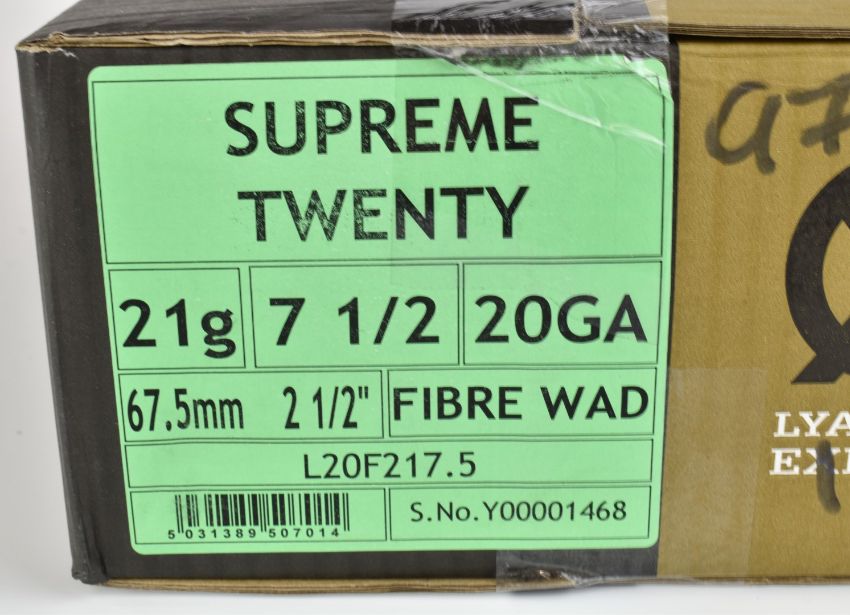 Two-hundred-and-fifty 20 bore Lyalvale Express Supreme Twenty 21g shotgun cartridges, sealed in packing box PLEASE NOTE THAT A VALID RELEVANT FIREARMS/SHOTGUN CERTIFICATE IS REQUIRED TO HANDLE/PURCHASE THIS ITEM. We are not able to post this lot.