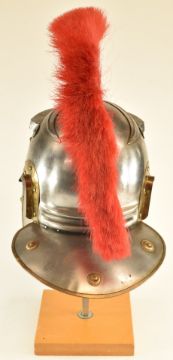 Replica Roman Centurion's steel helmet with red plume, brass edging and rosettes and leather lining.