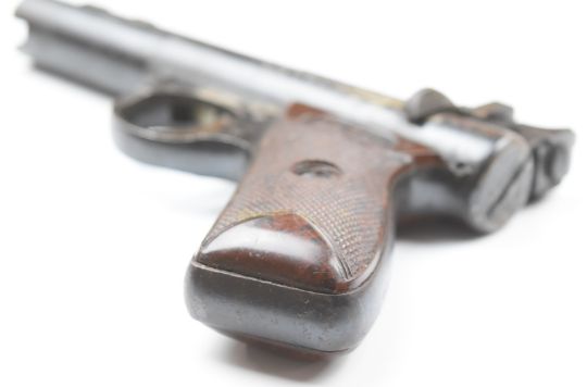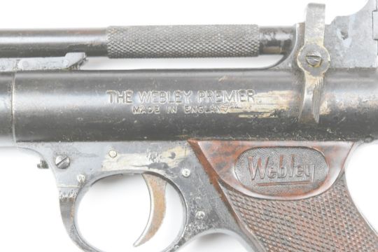 Webley Premier .22 air pistol with named and chequered Bakelite grips and adjustable sights, serial number 2197.