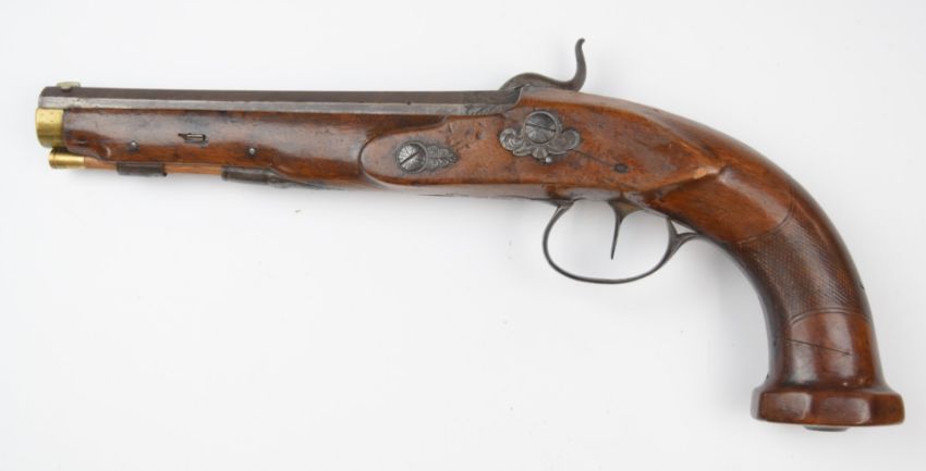 German percussion hammer action holster pistol with lock safety, engraved lock, hammer, trigger guard, butt plate and mounts, chequered grip, brass tipped wooden ram-rod and 7.5 inch octagonal barrel, overall length 35cm.