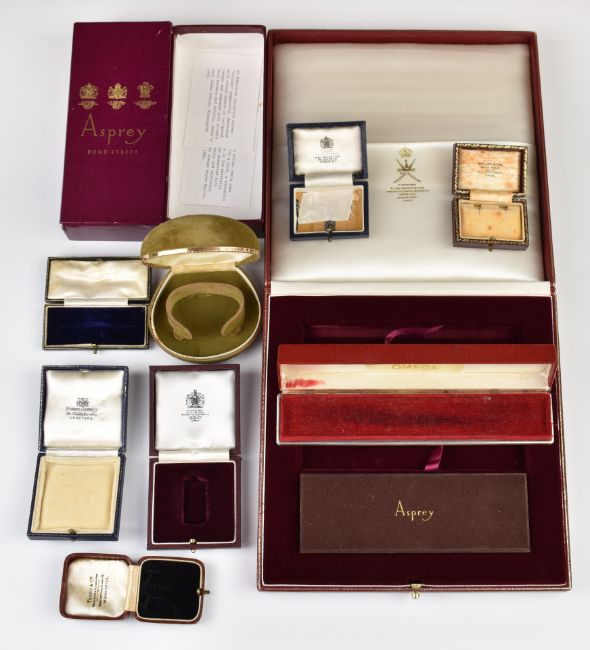 Ten vintage/ antique jewellery boxes including Asprey, Mallory, Pleasance & Harper, Omega, etc