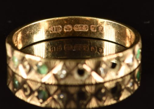 A 9ct gold ring set with diamonds and emeralds (two stones missing), 2.1g, size P