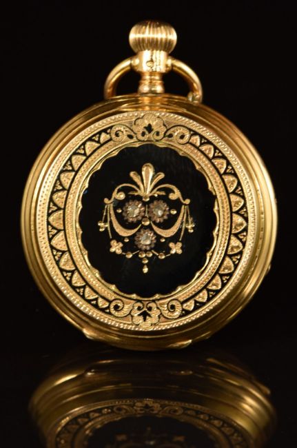 Robert Maret 18ct gold keyless winding full hunter pocket watch with blued hands, black Roman numerals, gilt decorated silver dial, black enamel inlaid and diamond set case and engraved Remontoir cylindre 10 Rubis movement, case diameter 36mm, serial number 12063, 38.5g.