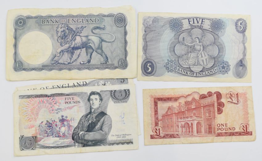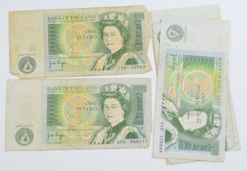 Over 60 Bank of England banknotes to include a set of three consecutive 10 shillings, 1963 first issue, signed J.Q. Hollom (M30 000533 – M30 000535), a set of three consecutive £1, 1970-1980, signed J. B. Page (U35 175848 – U35 175850), £5 1961, signed L. K. O'Brien and £1 Government of Gibraltar 1983