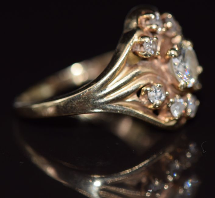 A 14k gold ring set with nine diamonds, the centre diamond approximately 0.7ct, 5.4g, size P