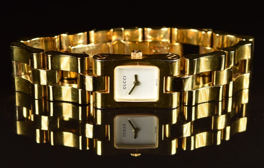 Gucci ladies wristwatch ref. 2305L with gold hands, white dial, gold plated case and quartz movement, on gold plated bracelet, case diameter 17mm.