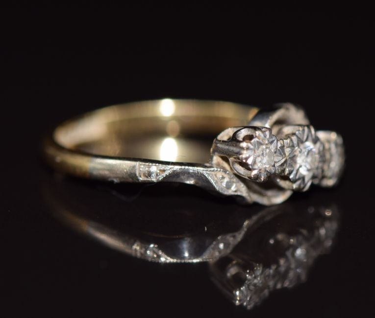 An 18ct gold ring set with three diamonds in a platinum setting, 2.7g, size K