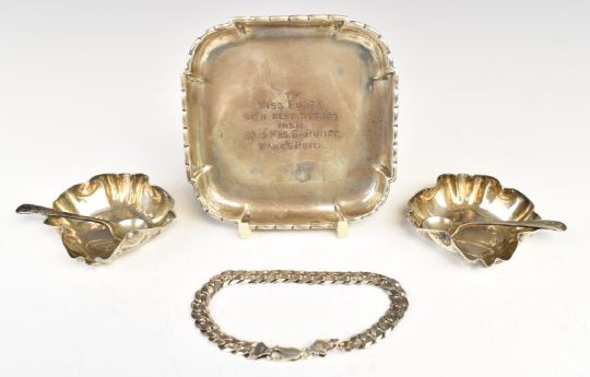 Pair of Victorian hallmarked silver open salts with crimped edges, Chester 1894, maker James Deakin & Sons, width 5cm, hallmarked silver pin dish, London 1940, maker  William Comyns & Sons Ltd and a curb link chain bracelet marked 925, weight of all items 90g