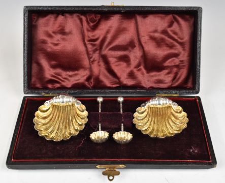Victorian cased pair of hallmarked silver salts formed as shells, with matching spoons, Birmingham 1987, maker's mark EG, weight of all items 23g
