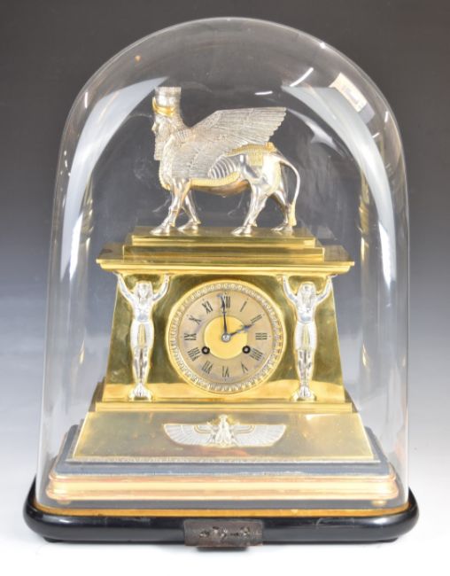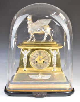 19thC Achille Brocot Egyptian Revival gilt and silvered metal mantel clock with mythical creature to top, under glass dome, height of clock 39cm