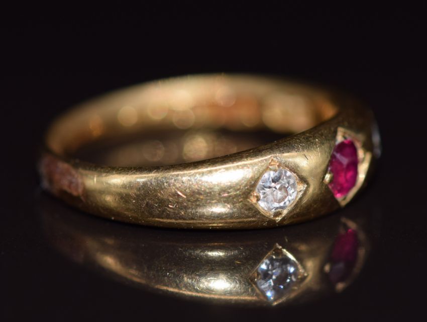 A c1900 18ct gold ring set with a ruby and diamonds, 4.3g, size K