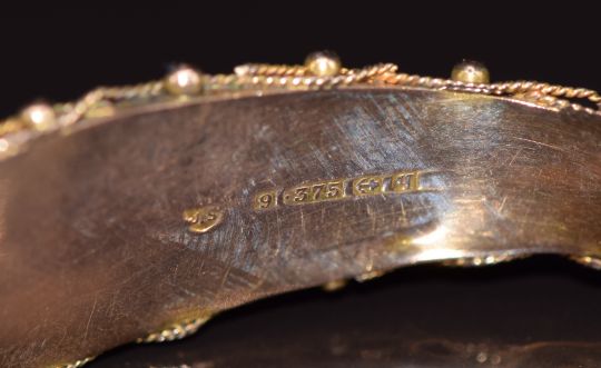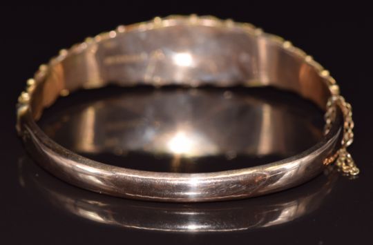 A 9ct rose gold bangle with scrolling rope twist and sphere decoration, Birmingham 1915, 9.4g