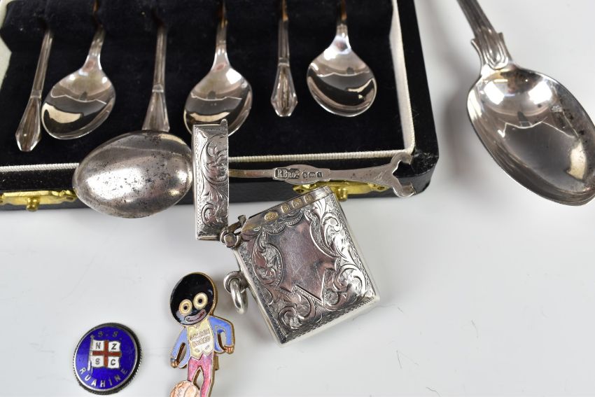 Cased set of hallmarked silver coffee spoons, further Victorian and later hallmarked silver spoons and an Edward VII hallmarked silver vesta case and a Robertson's Golly football badge, weight excluding badge 119g