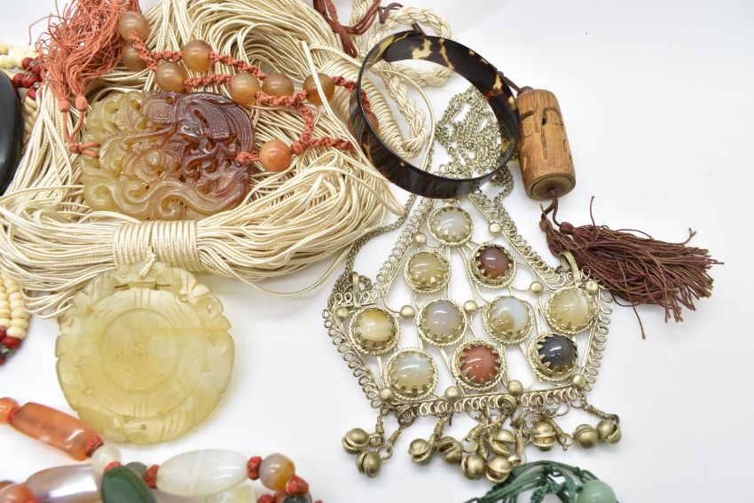 A large agate necklace, three jade style carved pendants, a large white metal pendant set with agate, carved bone snake bangle, etc