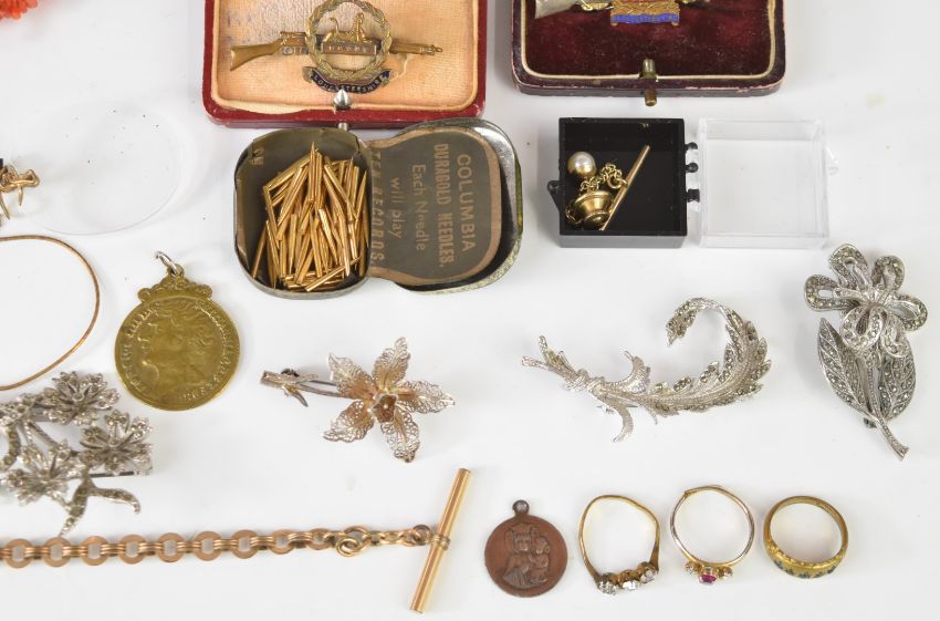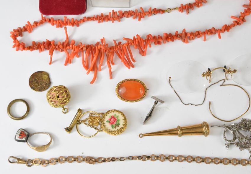 A collection of jewellery including brooches, rolled gold fob chain, vintage bracelet box, 9ct gold ring set with a diamond (0.5g), coral necklace, Exquisite brooch, etc