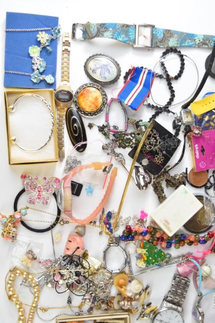 A collection of costume jewellery including brooches, necklaces, watches, coins, Parker pens, compacts, silver dressing table mirror, etc