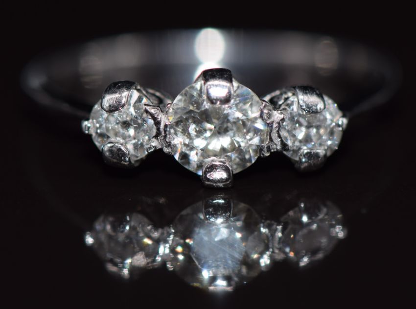 A platinum ring set with three diamonds, the centre diamond approximately 0.5ct, 1.3g, size O