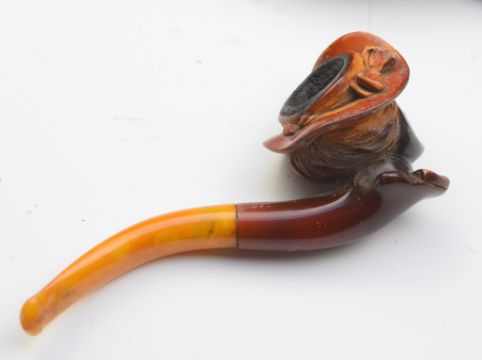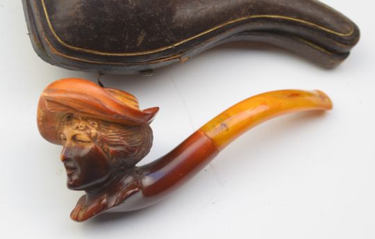 Carved Meerschaum figural pipe in case, two Black Forest or similar carved wooden figures including a chef, tallest 21cm and a pair of Georgian bronze candlesticks, height 21.5cm