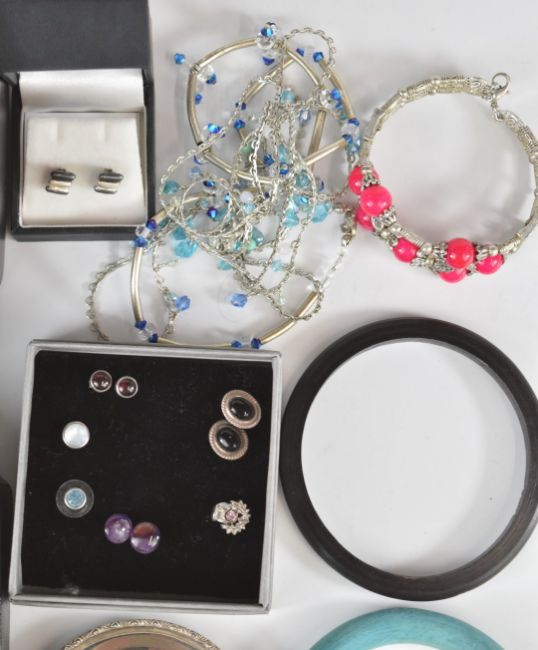 A collection of silver jewellery including brooch, rings, chains, bracelet, a 9ct gold coffee bean charm (0.4g), silver dish etc, in a jewellery box