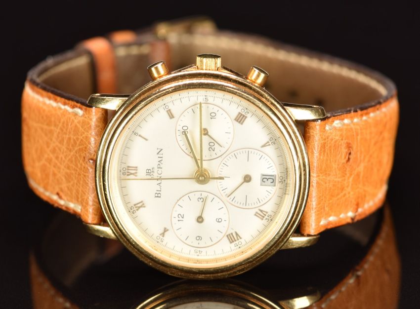 Blancpain 18ct gold gentleman's automatic chronograph wristwatch with date aperture, gold hands and Roman numerals, silver dial and signed Cartier 37 jewel calibre 205 movement, on tan ostrich leather strap, case diameter 34mm, serial number 324.