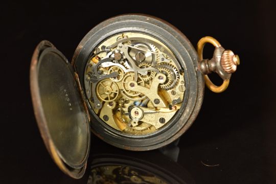 Charles Churchill & Co Ltd of Manchester keyless winding open faced centre seconds chronograph pocket watch with gold hands, black Arabic numerals, white dial, gunmetal case and unsigned movement, case diameter 52mm, serial number 82238.