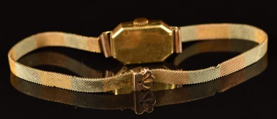 Two unnamed yellow metal ladies wristwatches both with ornate embossed decoration, one on bi-coloured 9ct gold bracelet, 26g.
