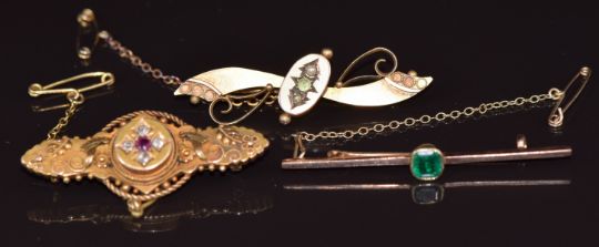 Edwardian 15ct gold brooch set with a ruby and old cut diamonds, verso a glass compartment (5.6g), 9ct gold brooch set with an emerald, and a 9ct gold brooch set with a peridot and seed pearls, Chester 1909, 5.4g
