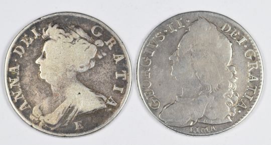 1707 Queen Anne half crown, Edinburgh 'E' below bust, together with a 1746 George II example, LIMA below bust, both about fine