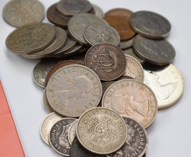 An amateur coin collection in the whole, including George IV 1826 penny, approximately 95g of pre-1920 silver coinage, approximately 63g of pre 1947 silver coinage, modern crowns etc