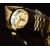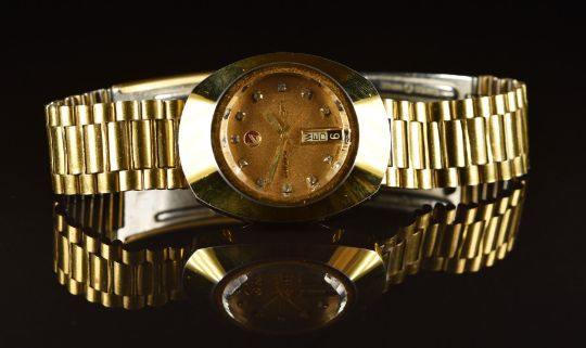 Rado DiaStar gentleman's wristwatch ref. 13 G-625.0013.3 with day and date aperture, luminous hands, bevelled gold hour markers, black dial, gold plated case and quartz movement, on gold plated bracelet, case diameter 35mm.