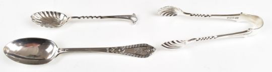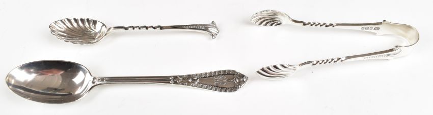 Cased set of Edward VII hallmarked silver teaspoons and tongs with shell shaped bowls, Sheffield 1906, maker Atkin Brothers, width of case 22cm, together with a cased hallmarked silver spoon, weight of all silver 135g
