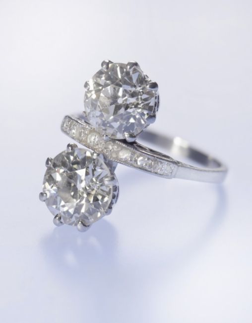 Art Deco platinum ring set with two transitional cut diamonds of approximately 2.1ct and 2ct and seven further diamonds to the band, 4.7g, size K