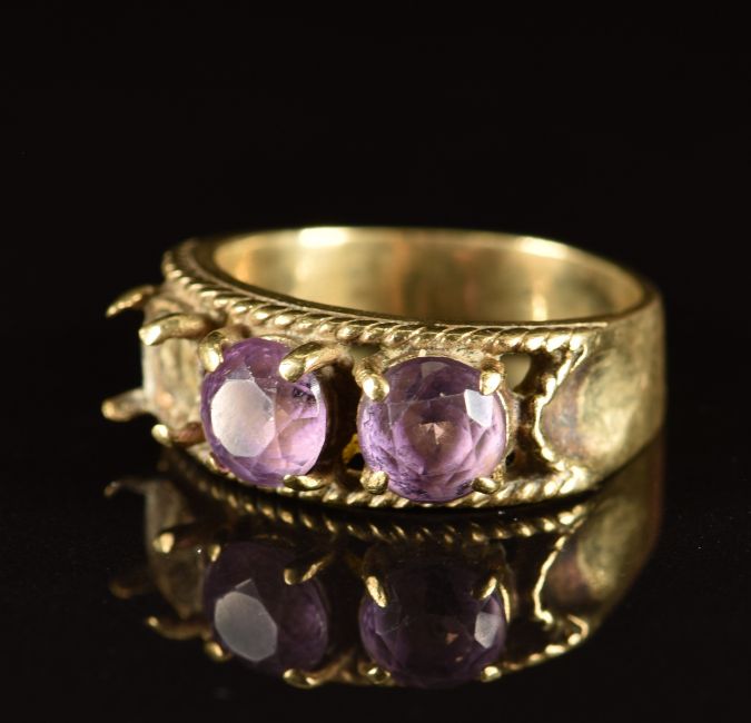 A 9ct gold ring set with smoky quartz (2g, size M) and a 14k gold ring set with amethysts (one missing), 4.6g, size N