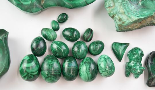Malachite carved stone items to include trinket box, bowls, eggs and beads, together with further geological samples, largest item length 23cm