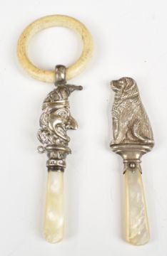 Two hallmarked silver baby's rattles comprising dog, Chester 1960, maker W H Collins & Co and a jester, Birmingham likely 1920 but indistinct, maker Crisford & Norris Ltd