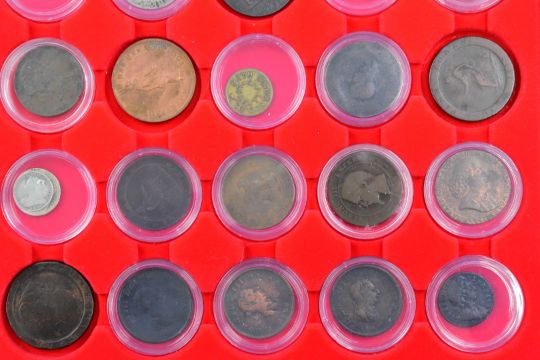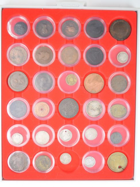 A collection of various tokens and coins including 1669 Tetbury token, 1700 William III farthing and sixpence, penny bank token etc, contained in a Lindner display case