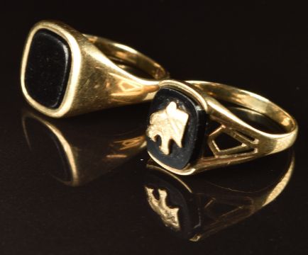 Two 9ct gold signet rings set with onyx, 9.5g, sizes R & T