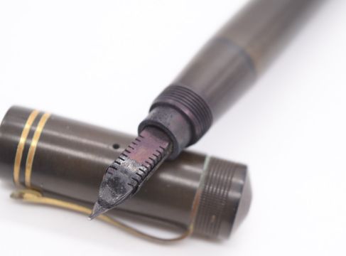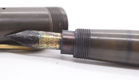 Ford's patent fountain pen, the gold nib marked Ford 428 Mill 14 carat, with brown Bakelite or similar body and gold plated fittings, length 14.5cm
