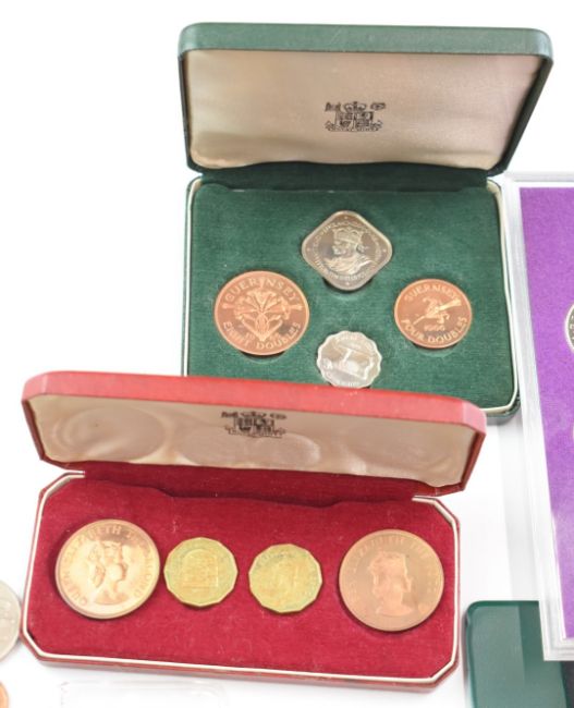 A collection of coin sets, Channel Islands, Falkland Liberation crown etc together with further collectable crowns, uncirculated coins etc including Lundy Puffin, sundry UK and overseas etc, some silver content